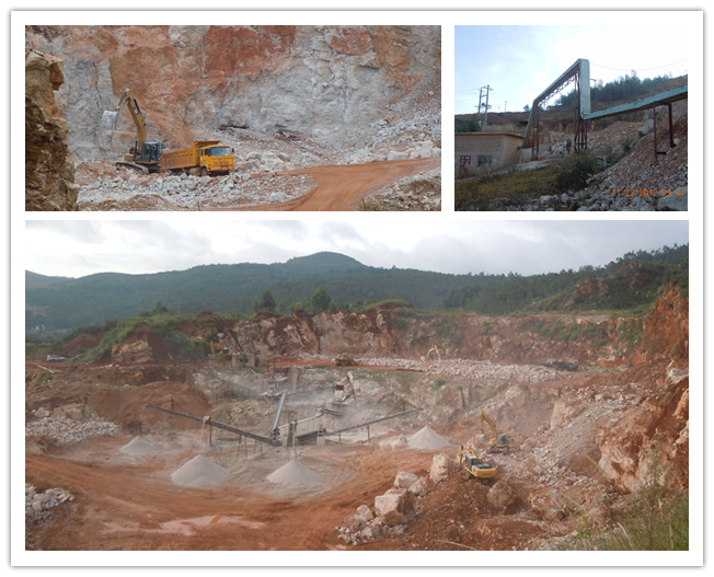 爆破后由挖掘機剝離礦石覆蓋物,利用裝載機將少量的廢石運輸至工業(yè)場地的平整和道路的修復(fù),礦石一部分通過裝載機鏟運運至破碎機受礦口,大塊的礦石通過挖掘機進(jìn)行破碎后通過裝載機鏟運至破碎機受礦口進(jìn)行破碎。