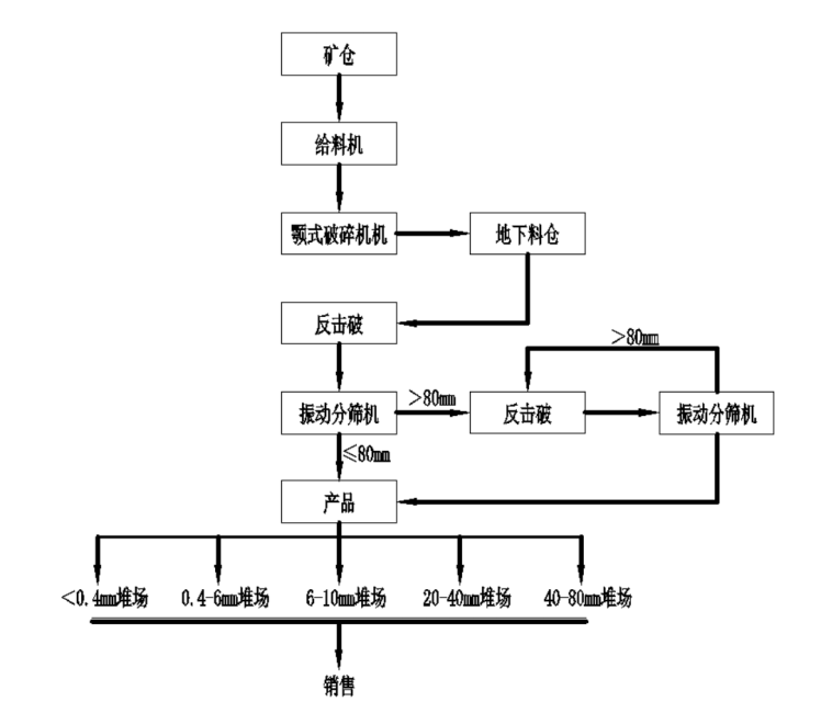 礦山現(xiàn)有破碎站采用兩級破碎、兩級篩分的閉路返回流程,機械化程度較高,可將礦石加工成不同需求的五級原料。破碎后的礦石原料對外進(jìn)行銷售,礦石加工工藝系統(tǒng)流程圖如下: