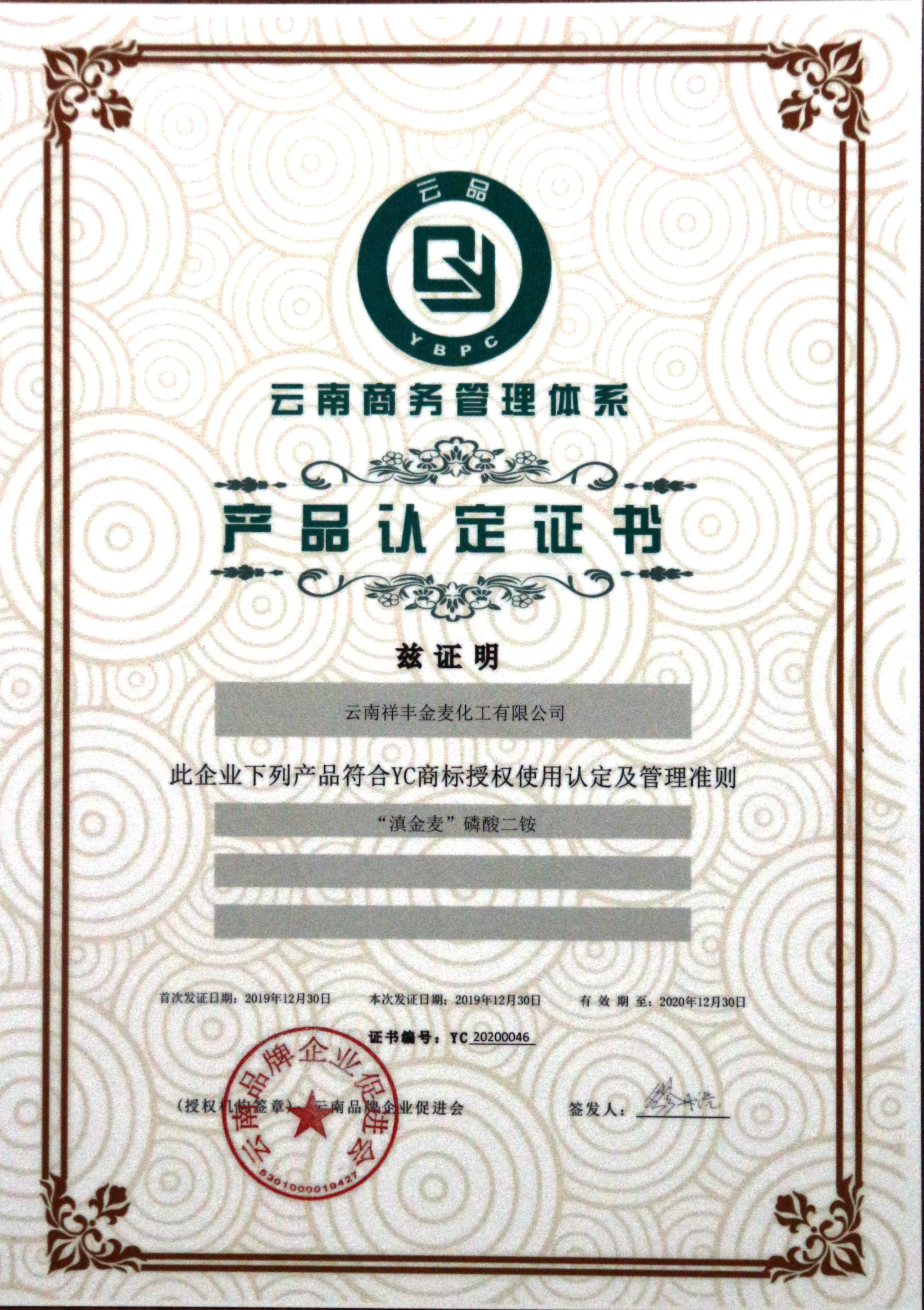 祥豐金麥“滇金麥”磷酸二銨符合YC商標(biāo)授權(quán)使用認(rèn)定及管理準(zhǔn)則