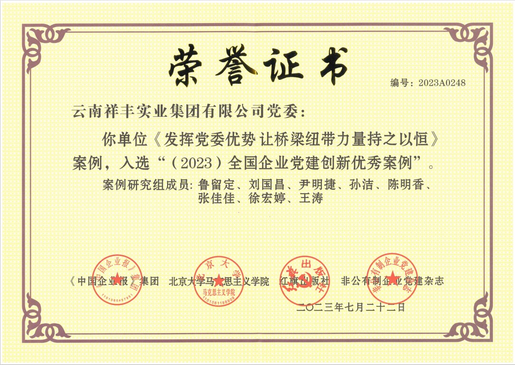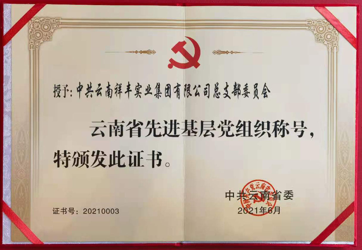 2013年7月,祥豐黨支部2011—2012年度"云嶺先鋒"工程被中共連然街道工作委員會評為"先進(jìn)基層黨組織";2013年7月,祥豐黨支部被中共安寧市委評為"基層黨建示范點";2013年7月,公司團工會楊洪銘被推薦為"安寧市青年聯(lián)合會第二屆委員會委員";2013年7月,公司團工委組織公司全體職工團員青年開展"愛心水窖"捐款活動,祥豐集團
