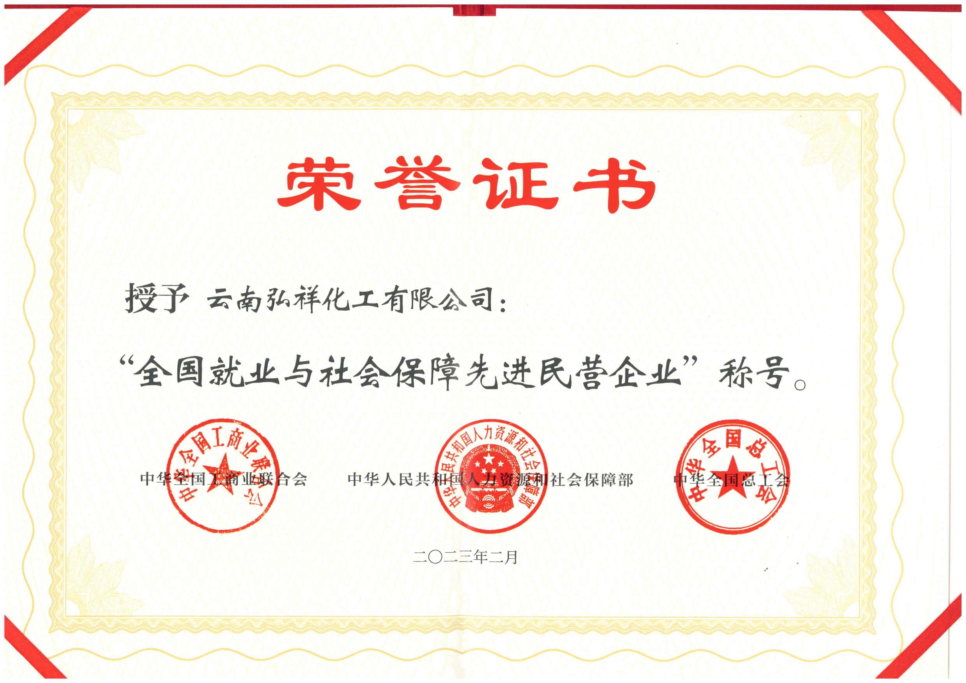 云南弘祥化工有限公司榮獲“全國就業(yè)與社會保障先進民營企業(yè)”稱號