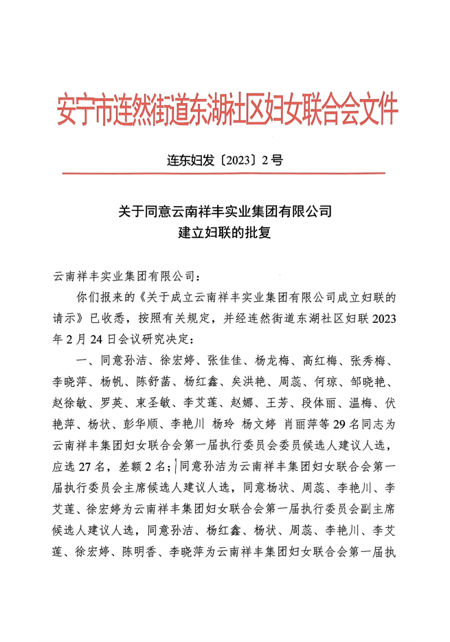 經(jīng)安寧市連然街道東湖社區(qū)婦女聯(lián)合會“聯(lián)東婦發(fā)[2023]1號”、“聯(lián)東婦發(fā)[2023]2號”文件批復(fù),云南祥豐集團(tuán)于2023年3月2日召開婦女代表大會,正式組建云南祥豐實業(yè)集團(tuán)有限公司婦女聯(lián)合會。