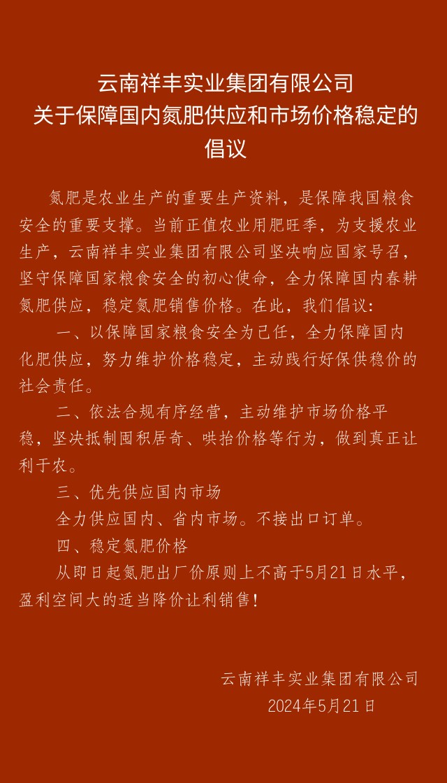 云南祥豐實(shí)業(yè)集團(tuán)有限公司 關(guān)于保障國(guó)內(nèi)氮肥供應(yīng)和市場(chǎng)價(jià)格穩(wěn)定的 倡議